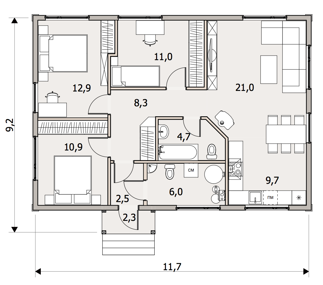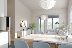 Базовое предложение предполагает установку в доме отопительного электрокотла мощностью 9 кВт или 14 кВт в зависимости от проекта. Для приготовления горячей воды устанавливается электрический бойлер объемом 150 л. В дальнейшем систему можно оснастить газовым котлом и бойлером косвенного нагрева, оставив электрокотёл в качестве резервного.