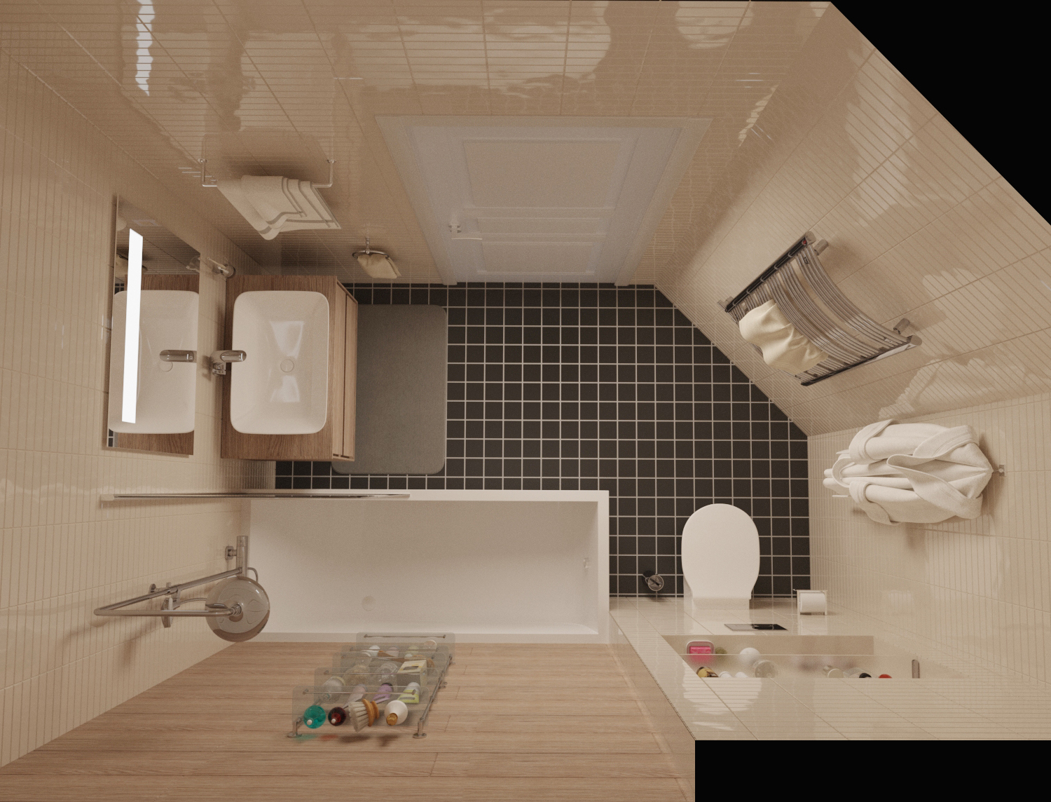 Для основания чёрного пола используется экспортная строганая доска камерной сушки собственного производства. Особая форма доски «soft angle» увеличивает её стойкость к возгоранию. Доски сечением 145х45 мм монтируются с шагом 300 мм, что полностью исключает прогиб пола и способствует удобной разводке скрытых инженерных коммуникаций: отопление, электрика, водоснабжение.