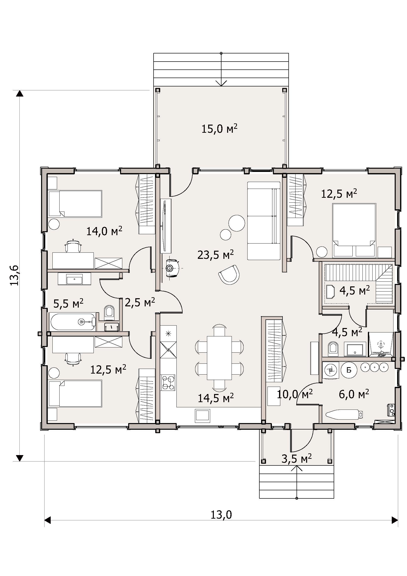 Базовое предложение предполагает установку в доме отопительного электрокотла Protherm (Протерм) Скат мощностью 9 кВт или 14 кВт в зависимости от проекта. Для приготовления горячей воды устанавливается электрический бойлер объемом 150 л. В дальнейшем систему можно оснастить газовым котлом и бойлером косвенного нагрева, оставив электрокотёл в качестве резервного.