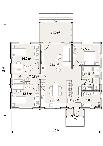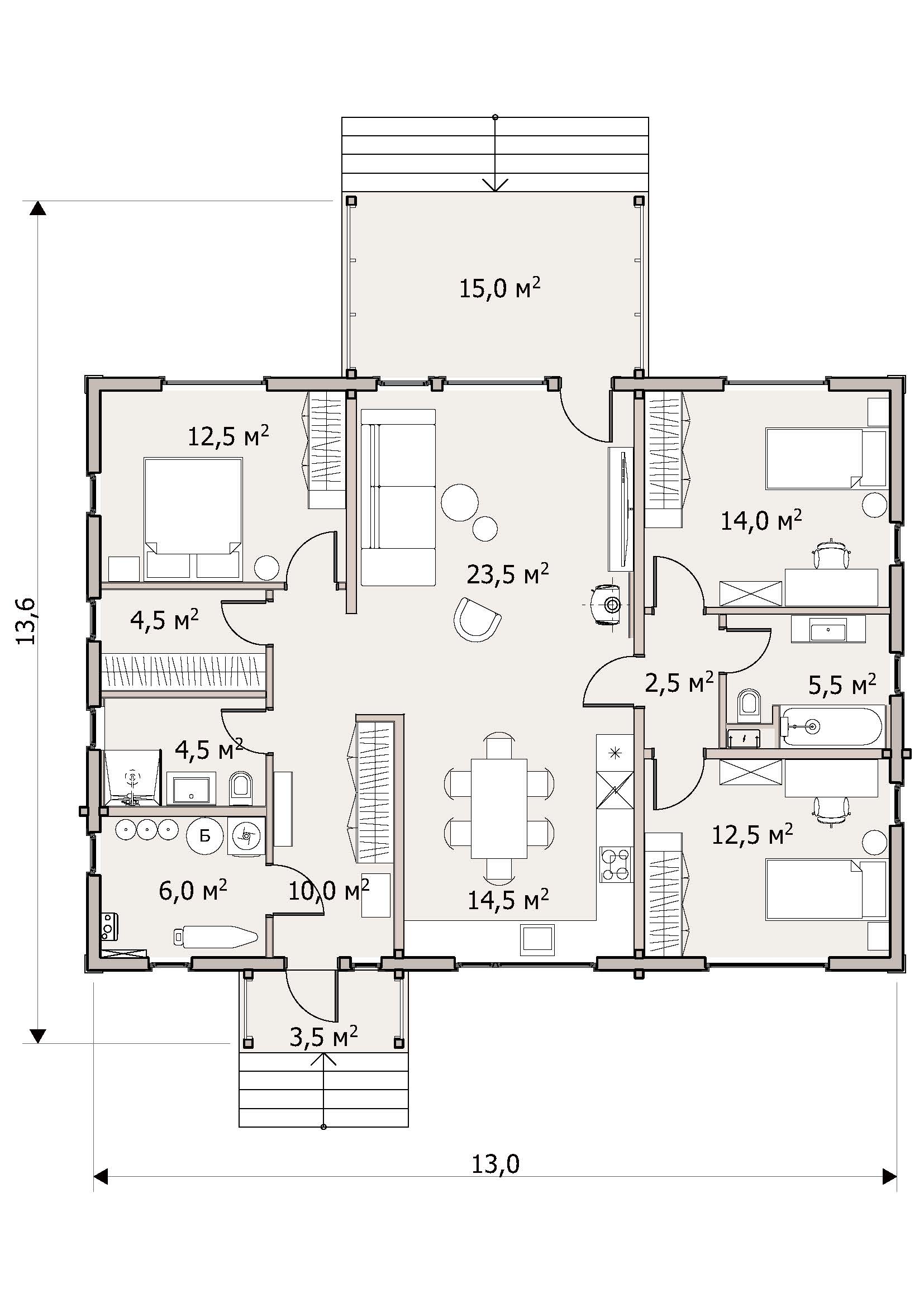 Базовое предложение предполагает установку в доме отопительного электрокотла мощностью 9 кВт или 14 кВт в зависимости от проекта. Для приготовления горячей воды устанавливается электрический бойлер объемом 150 л. В дальнейшем систему можно оснастить газовым котлом и бойлером косвенного нагрева, оставив электрокотёл в качестве резервного.