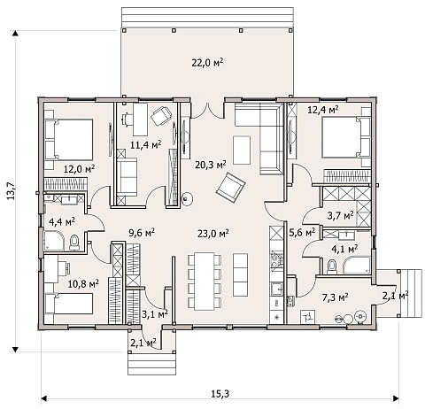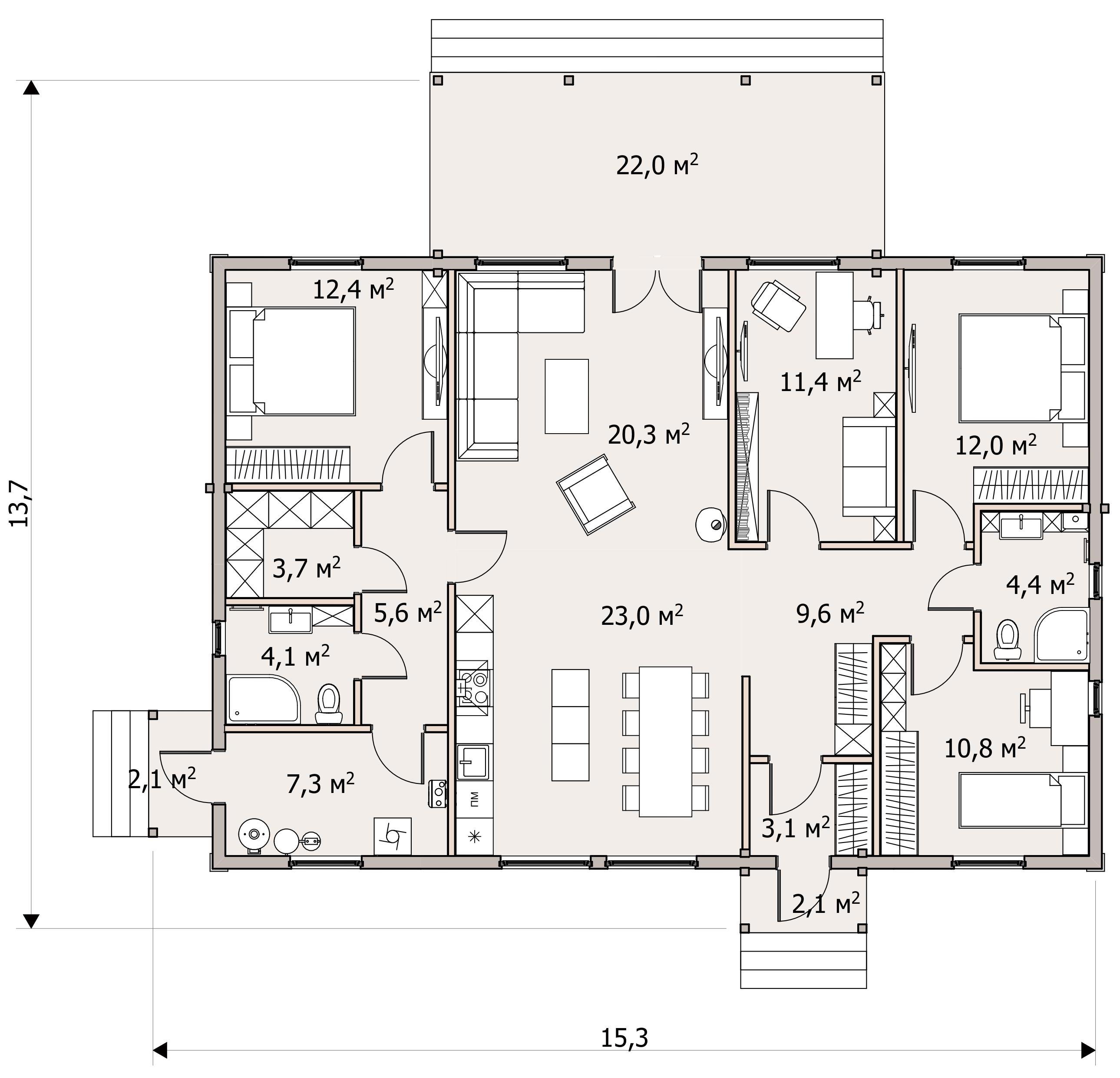 Базовое предложение предполагает установку в доме отопительного электрокотла мощностью 9 кВт или 14 кВт в зависимости от проекта. Для приготовления горячей воды устанавливается электрический бойлер объемом 150 л. В дальнейшем систему можно оснастить газовым котлом и бойлером косвенного нагрева, оставив электрокотёл в качестве резервного.