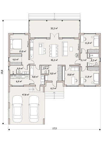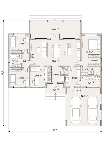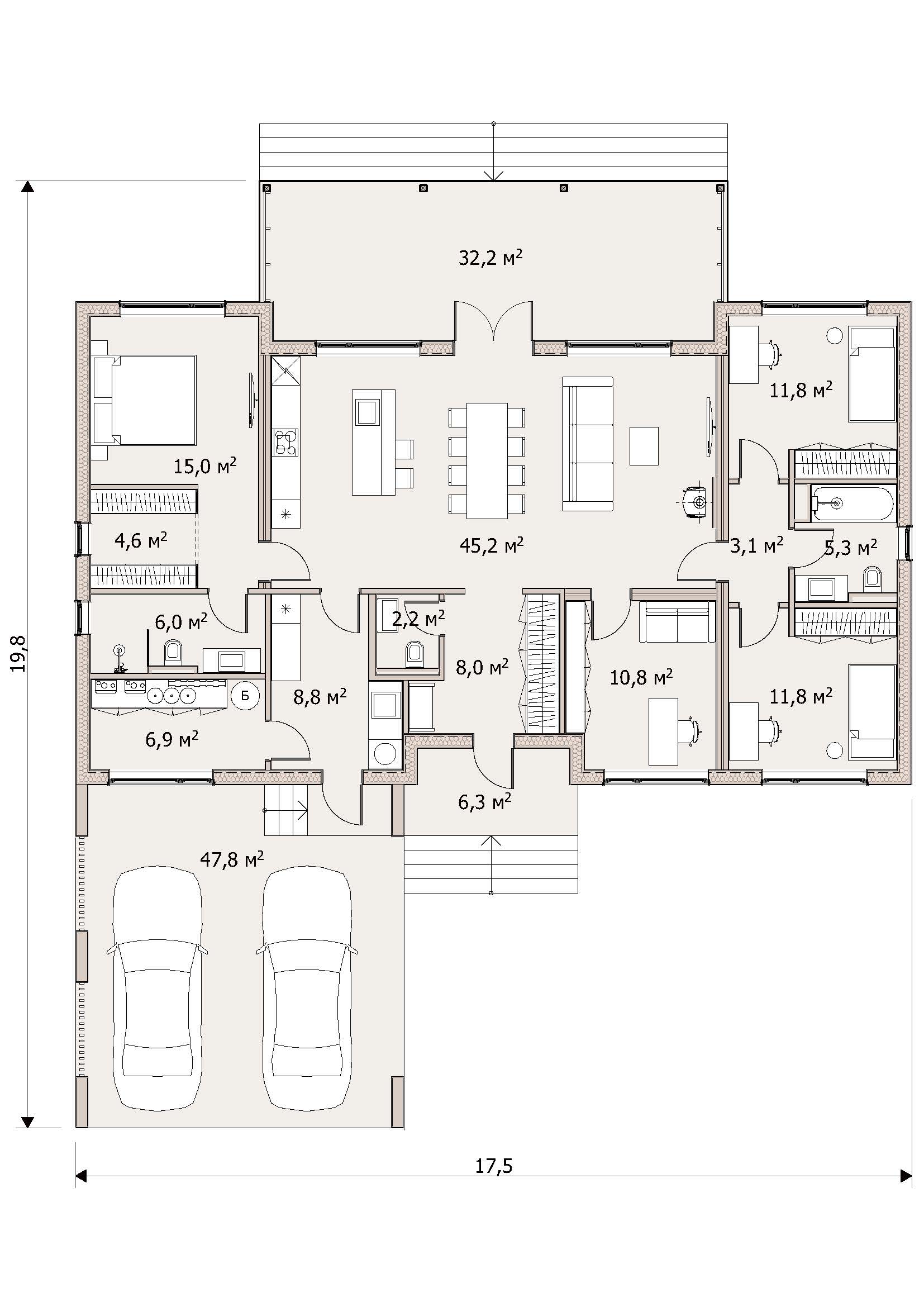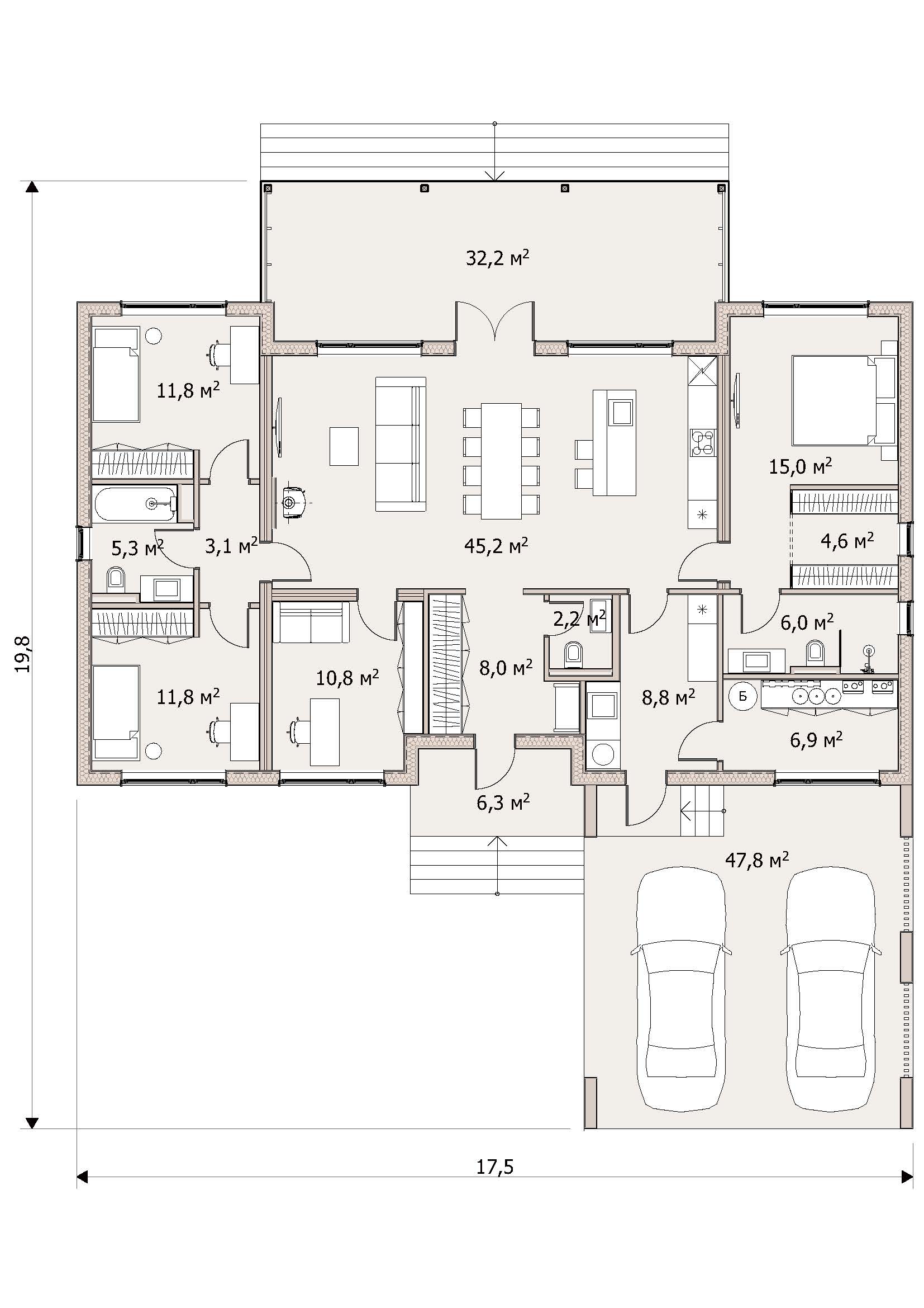 Базовое предложение предполагает установку в доме отопительного электрокотла мощностью 9 кВт или 14 кВт в зависимости от проекта. Для приготовления горячей воды устанавливается электрический бойлер объемом 150 л. В дальнейшем систему можно оснастить газовым котлом и бойлером косвенного нагрева, оставив электрокотёл в качестве резервного.