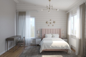 Каркас внутренних перегородок – доска "soft angle" 45х95 мм экспортного качества камерной сушки строганая. Отделка внутренних стен - Гипсовая плита повышенной прочности Gyproc Аква Стронг 15мм. Доска изготавливается полностью на нашем производстве. От сушилок до строжки и сборочной линии. Стены поставляются в собранном виде с интегрированными гофрами для скрытой электропроводки.