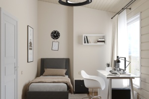 Каркас внутренних перегородок – доска "soft angle" 45х95 мм экспортного качества камерной сушки строганая. Отделка внутренних стен - Особопрочная гипсостружечная плита 12 мм. Доска изготавливается полностью на нашем производстве. От сушилок до строжки и сборочной линии. Стены поставляются в собранном виде с интегрированными гофрами для скрытой электропроводки.